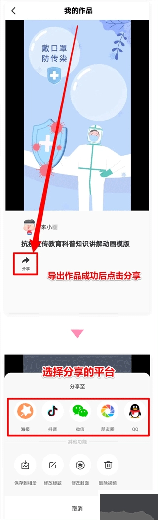 3、完成封面标题设置后,再次点击【导出】,即可一键分享作品至多个社交平台,与好友共享。