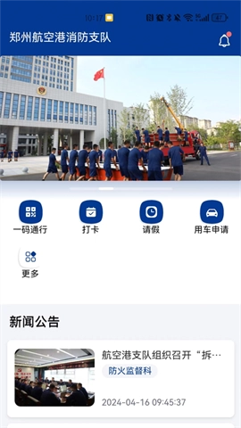 航空港消防,是一款专门针对航空港消防支队精心设计的综合管理服务软件。该软件借助智能化的消防管理办公模式,构建起一体化的消防救援工作平台,全方位满足消防人员办公过程中所面临的各类需求。从码通行、值班交接,到访客管理、用印申请、用车申请等一系列管理功能一应俱全,为日常办公带来了极大的便利。用户不仅能够进行考勤打卡,记录上下班出勤状况,还可随时在线提交请假、用车或用印申请。除此之外,软件会实时推送航空港消防救援的相关新闻动态,确保用户第一时间掌握最新信息。有需求的用户,赶快下载航空港消防软件吧!