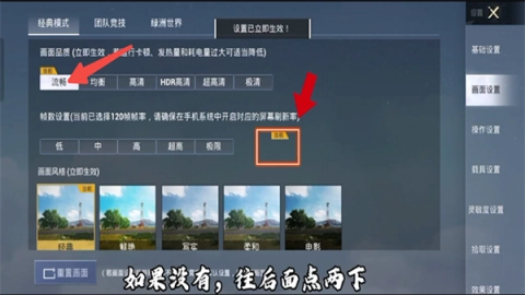 10、在相关设置选项中找到画面设置,点选流畅模式,之后确认当前所选设置即可。