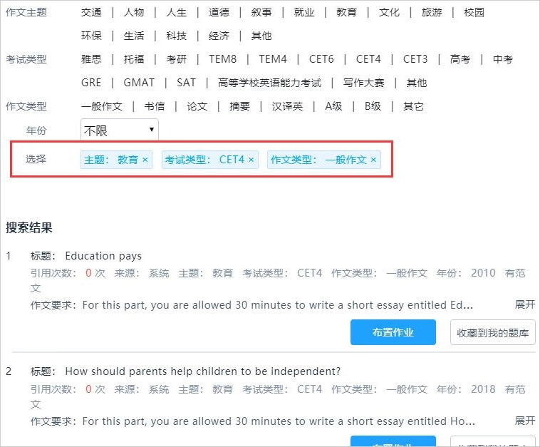 2. 进入后,大家能够依据作文主题、考试类型、作文类型以及年份来作出选择。