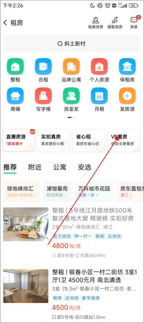 2、进入租房界面,找到vr看房,这边还包括了直播房源,实拍真房,省心租功能。