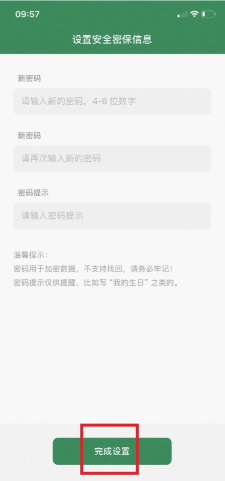 2、进入会提示先设置应用密码,设置好后点击完成设置,即可进入应用首页
