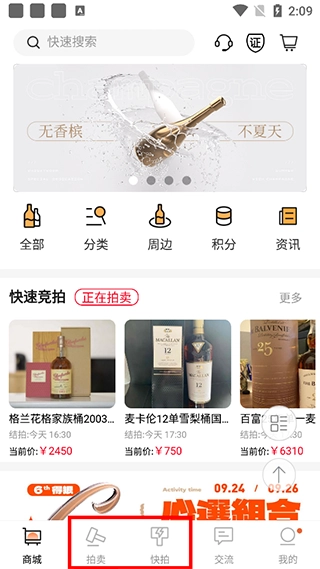 1. 进入酒虫网,在首页底部点击【拍卖】或者【快拍】,即可参与拍卖。
