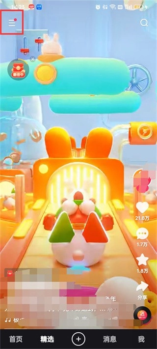 1、首先打开快手软件,进入到首页中后可以查看到最新播放的视频,在这里我们点击左上角的【三横图标】。