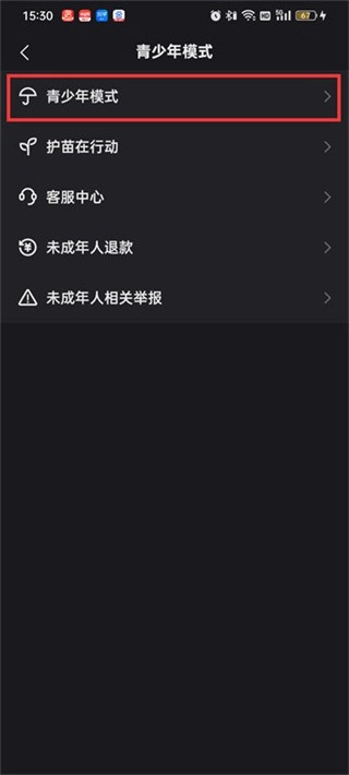 3、接着来到青少年模式的页面中有青少年模式、护苗在行动、客服中心等功能,我们点击【青少年模式】。