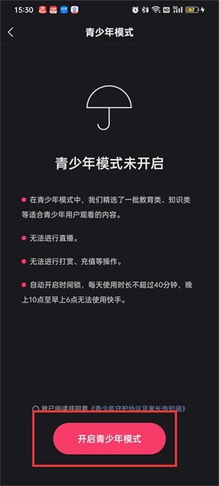 4、最后点击过后进入到青少年模式的页面中我们勾选上协议之后点击【开启青少年模式】即可。