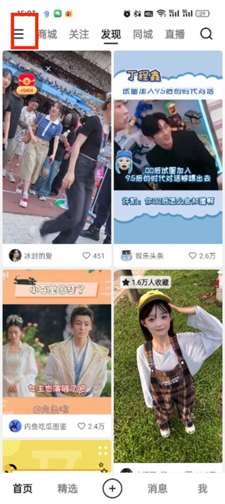 1、首先打开快手,进入到首页中后我们点击左上角的【三横图标】。