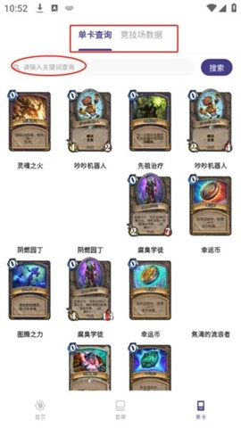 4、在“单卡”功能页面,用户点击单卡进入后,不仅能在线查询单卡、搜索竞技场数据,还能通过输入关键词进行查找。