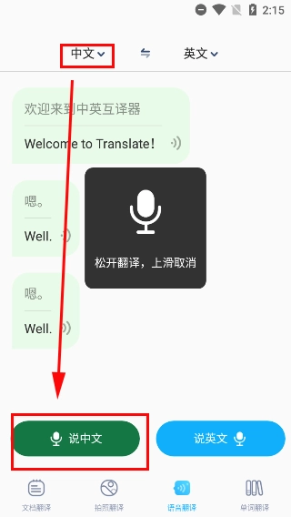 3、关于语言翻译,在上方进行切换,就能直接更改输入的语种。按住下方的录音按钮便可开始说话,说完话松开按钮,即会开始翻译。