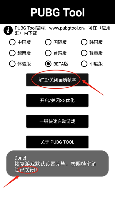 2、进入PUBGTool主界面,选择对应的PUBG版本(PUBG国际服体验服对应的是BETA版)。