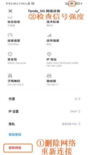 若手机已连接路由 WIFI 信号却无法上网,可先断开或忘记手机的 WIFI 连接,然后重新连接路由器信号。接着,排查手机信号强度(如下图所示),若信号较差,适当靠近路由器后再次测试能否上网。