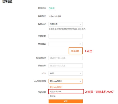第四步:要是宽带网络处于正常状态,且路由器 WAN 口信息配置也准确无误,但路由器还是无法成功联网,此时建议点开【联网设置】-【高级设置】,找到【MAC 地址克隆】选项,选中【克隆本机 MAC】后再次尝试连接,等待几分钟,查看能否联网成功。