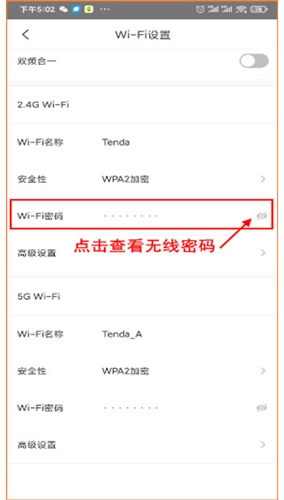 2、进入 WIFI 设置界面,点击 WIFI 密码后的眼睛图标,就能查看当前 WIFI 的密码。