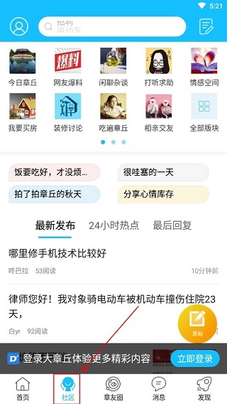 2. 进入社区之后,点击图中所示位置的【发帖】功能按钮,就能进行发帖操作。
