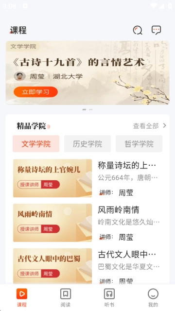 精品课程学习板块:涵盖文学、历史、哲学等多个学院的精品课程,方便用户在线学习。