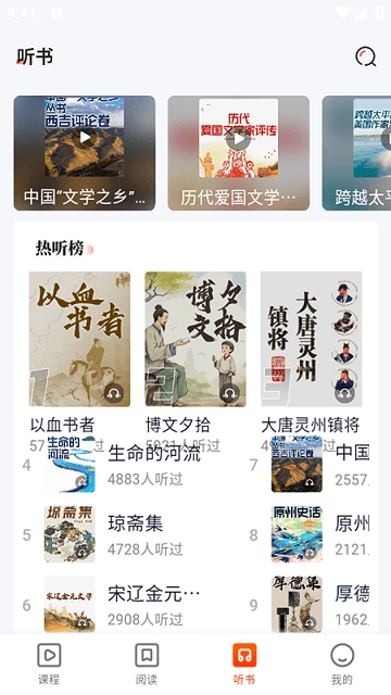 4、在主界面中,找到“听书”板块。在这里,你既可以浏览推荐的有声书,也能查看“热听榜”。当看到自己想听的有声书时,点击它,就会进入该有声书的详情页,接着点击播放按钮,便能开始聆听。
