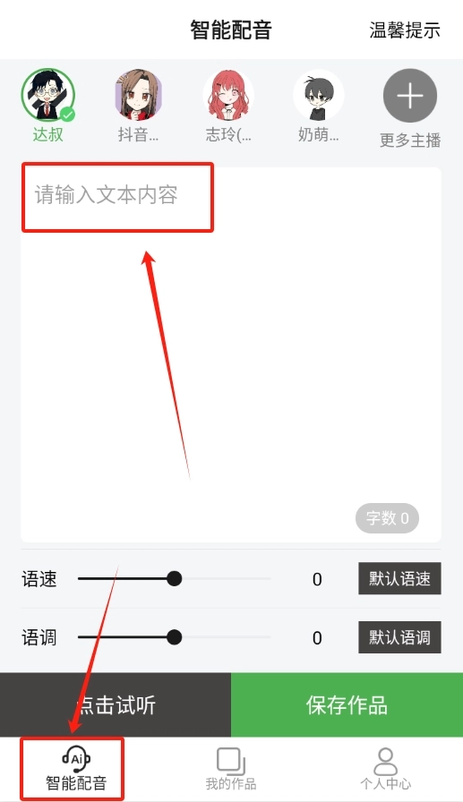 2、接下来挑选心仪的音色,选好之后点击试听按钮,听听实际效果。要是觉得满意,就点击保存作品,如此一来,配音便初步完成了,并不复杂。
