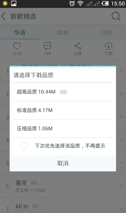 接着从提示面板里挑选歌曲的品质,这时便会自动在后台运行了。