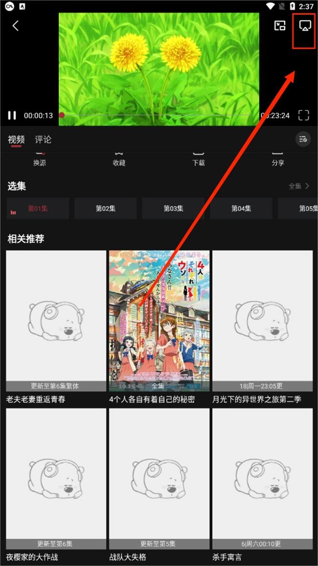 3、点击动漫,进入播放界面,然后点击右上角的投屏标志。