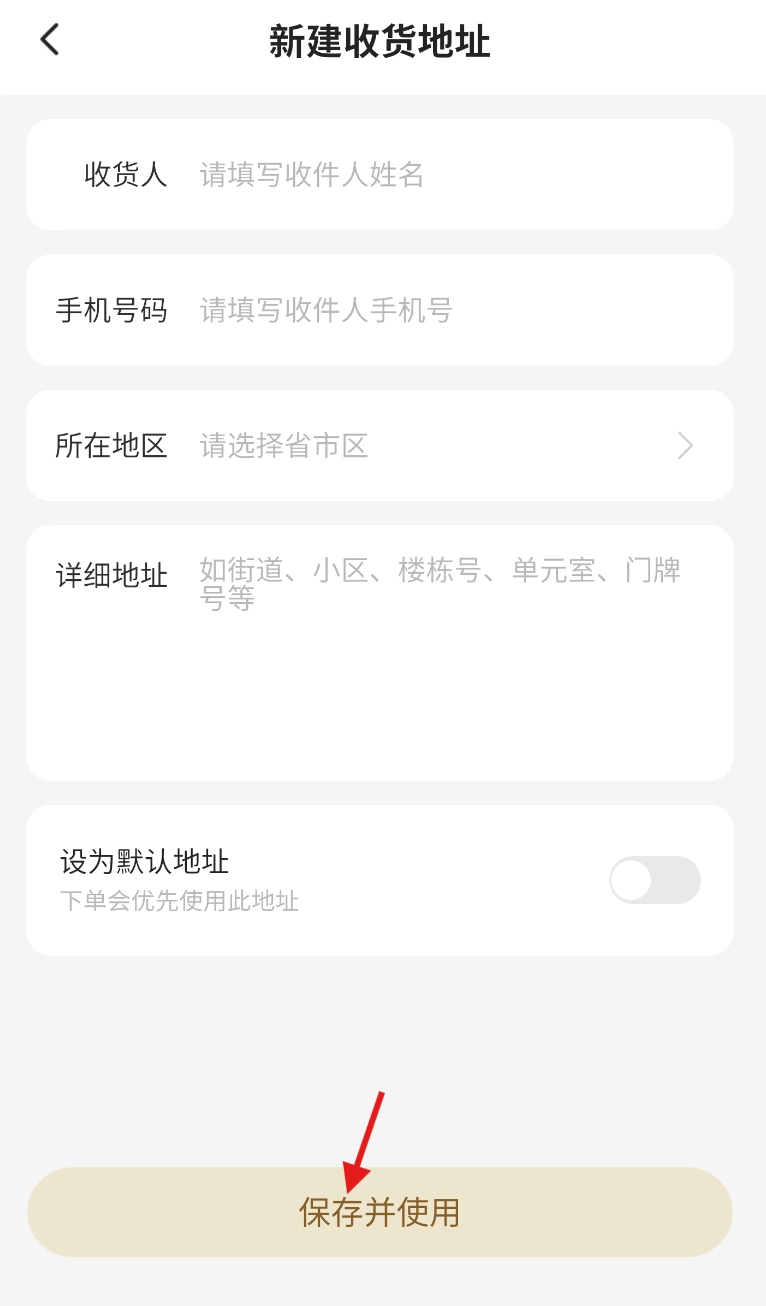 5、按顺序填写详细地址、联系人以及联系方式等相关内容,确认信息准确无误后,点击“保存并使用”,即可完成添加操作。