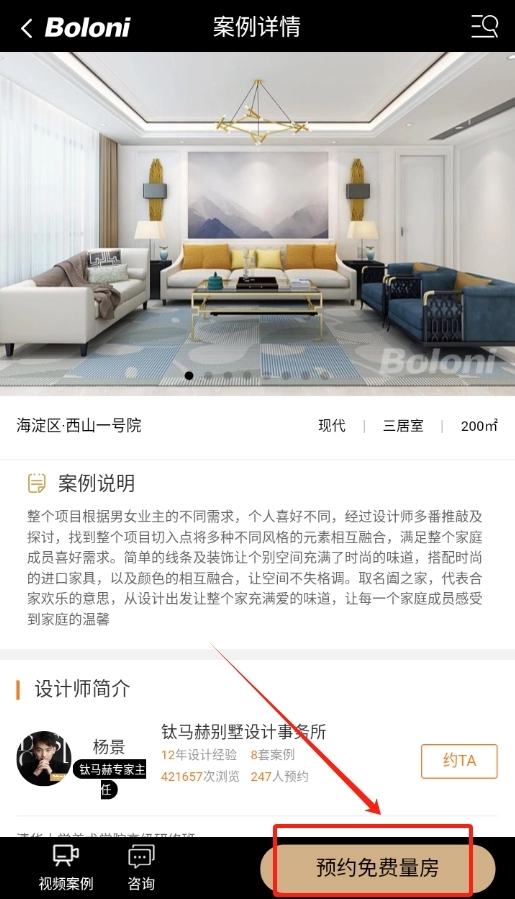 4、挑选钟意的整装品牌,预约设计师,即可获得免费的个性化装修方案设计服务。