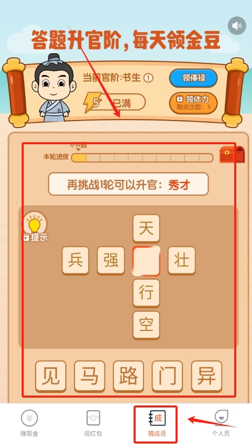 3、此外,猜成语页面设有猜成语活动,若能猜对,便可获得金币。