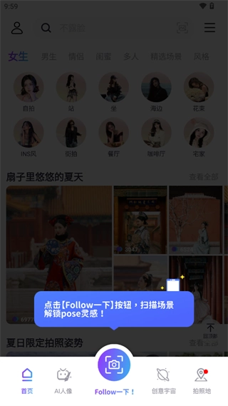 1、在本站并安装Follow相机后,进入应用,点击最下方导航栏“Follow一下!”