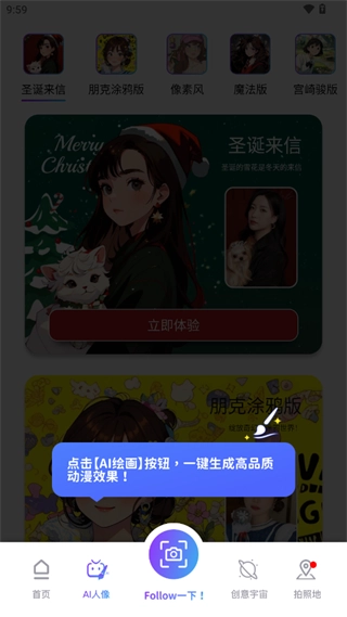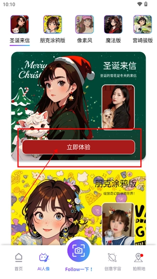 4、在这里有各种模板的人像,包括圣诞版、宫崎骏版、朋克涂鸦版、像素版等,选择自己喜欢的风格,点击立即体验