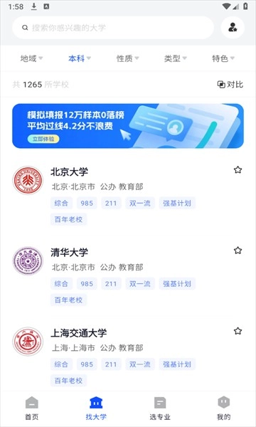 2、既能够在软件里翻阅浏览,也可以直接在搜索框中查找自己想要了解的大学。