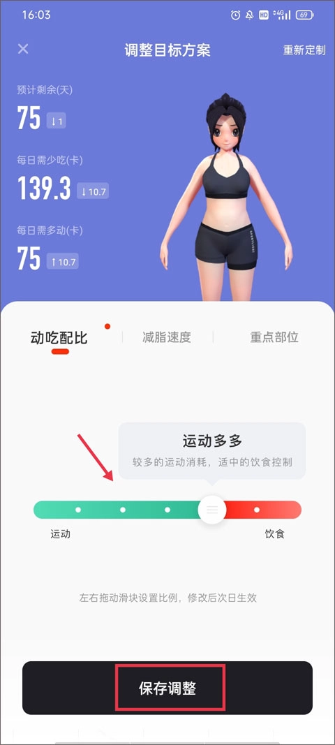 3、通过手指滑动中间的杆子,对每日饮食记录进行调整,调整完毕后,点击下方的“保存调整”按钮即可。