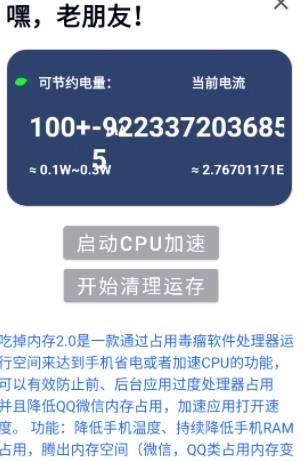 4、点击加速后需要挂在后台哦,手机发烫过与严重建议多次点击,可以通过CPU检测软件和耗电工具直观看到本软件效果;