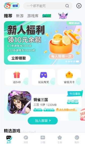 首页新人福利板块,只要完成指定条件,就能领取10元余额和0.1折游戏券,轻松获取游戏资源
