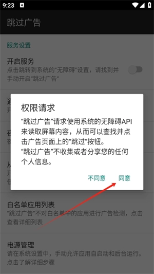当触发“跳过广告”功能后,会呈现对应的设置页面。操作时需先启用服务功能,另外从使用体验角度,建议同时开启相关的通知提醒选项。