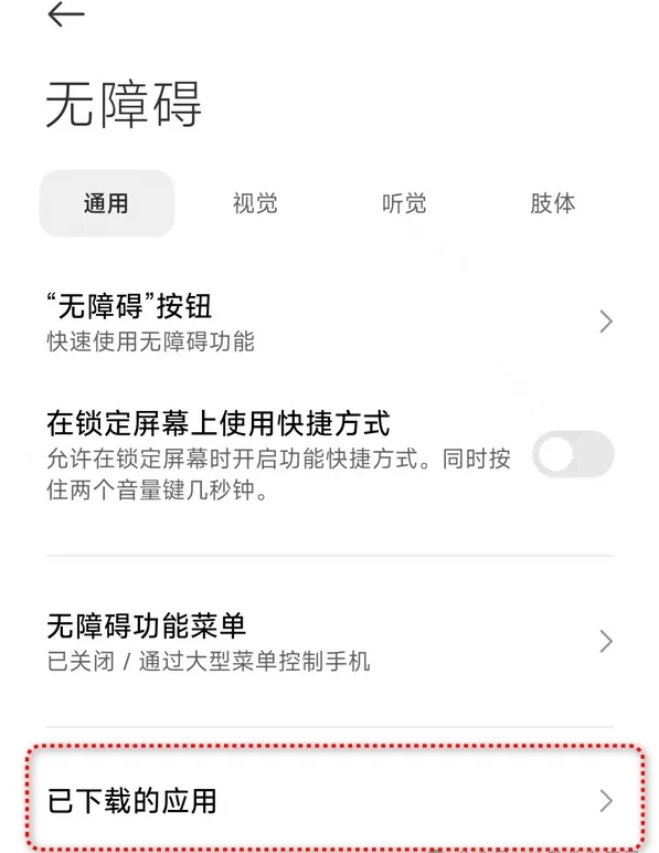 这是会跳转到无障碍设置界面,点击“已的应用”