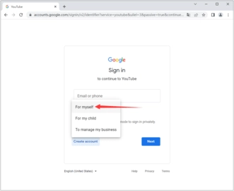 接着页面会跳转到谷歌的账号注册页面(毕竟谷歌和YouTube同属一家公司),此时我们需要点击页面底部的“Create account”按钮。