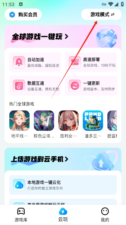 您可以在这里点击云玩,接着选择右上角的游戏模式进行切换就可以了。