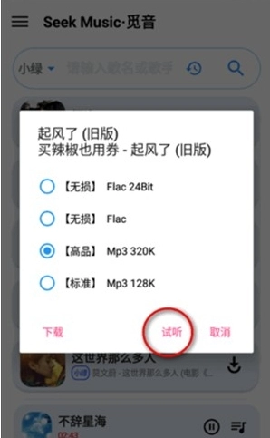 找到喜欢的歌曲后,点击进入播放页面,就能选择播放音质,还可以在线试听或收听。