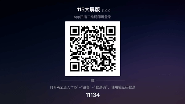 在电视上启动115大屏版后,屏幕会显示用于登录的二维码和验证码。