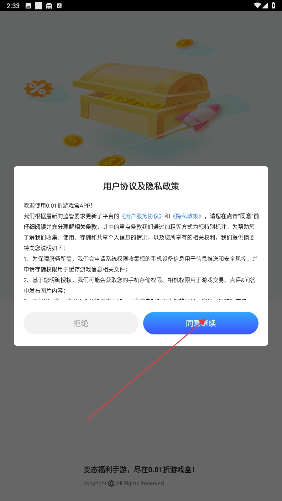 当你第一次打开这个能享受0.01折优惠的游戏盒子时,需要点击“同意并继续”按钮来确认接受相关协议内容。