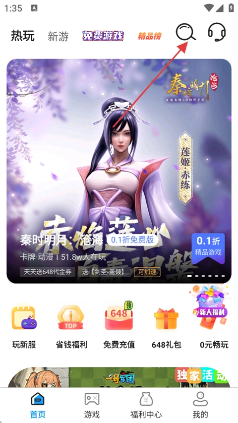在首页,可通过顶部搜索栏查找心仪游戏,也能点击分类标签进行筛选。