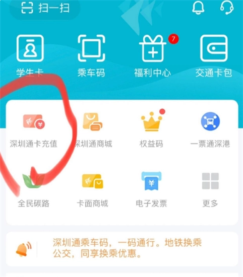 所有操作步骤执行完毕后,回到应用的主页面,找到并点击“深圳通卡充值”这个功能选项。