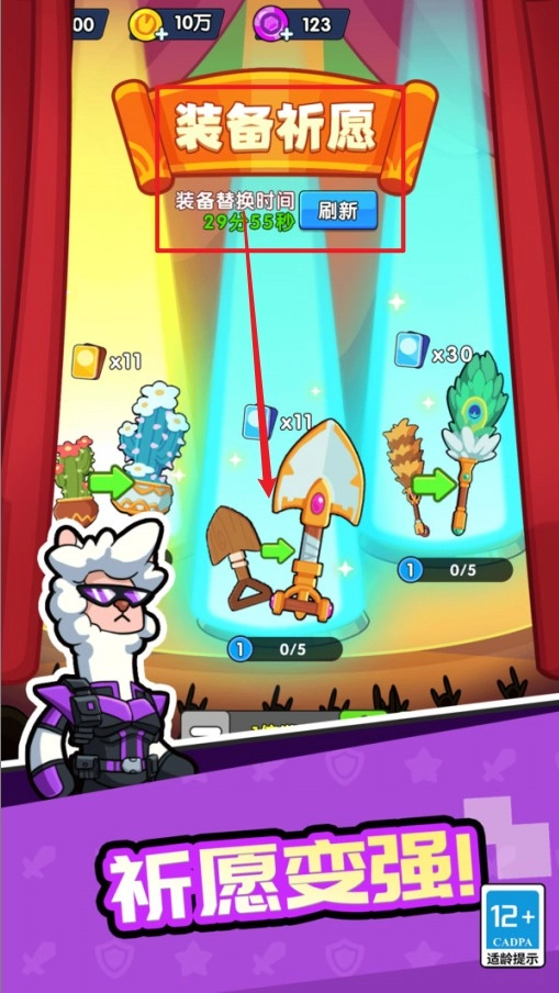 装备祈愿:进入祈愿界面使用祈愿币,有概率获取稀有装备和武器。