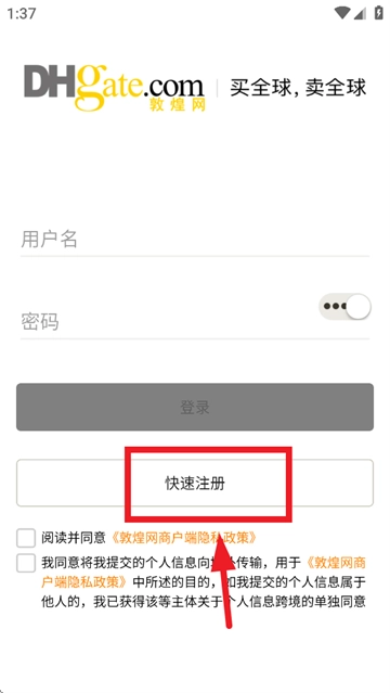 请输入手机号与验证码,勾选“阅读并同意”相关协议及政策(包括《DHgate.com供应商服务协议》《敦煌网商户端隐私政策》《跨境收付款服务协议》《跨境收付款服务个人资料+(私隐)政策》《飞来汇服务协议》《飞来汇隐私政策》),并确认同意同步开通飞来汇账户、同意将提交的个人信息向境外传输(用于《敦煌网商户端隐私政策》所述目的)。若提交的个人信息涉及他人,需确保已获得该主体对个人信息跨境的单独同意,之后点击“注册账号”即可完成操作。