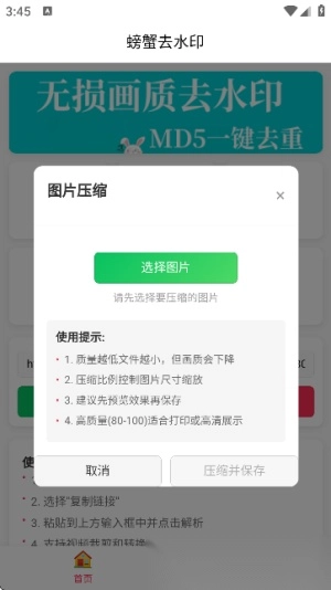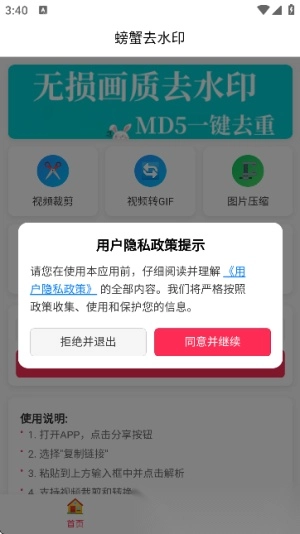 并安装螃蟹去水印大师,打开该应用后,需同意其用户协议与隐私政策。