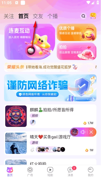 打开软件进入首页,点击上方交友