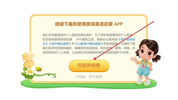 打开应用后,在弹出的美琪英语启蒙相关协议窗口里,找到并点击“同意并使用”选项。