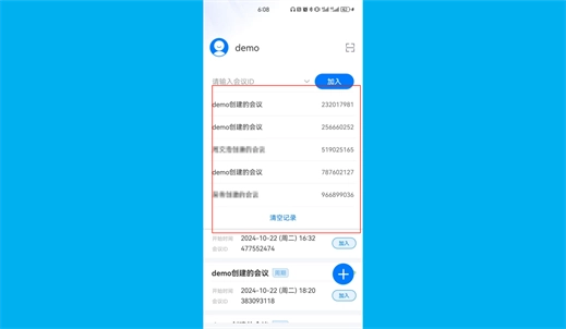 ①若您之前使用会议ID加入过会议,可点击会议ID输入框旁的下拉图标,然后在弹出的下拉列表里选择对应的会议直接进入。
