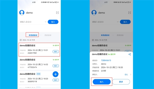 您参与过的各类会议(包括自己创建、受邀加入或主动参加的)都会自动归集到会议列表中。若想查看会议详情,可在首页的“未完成会议”板块找到状态显示为“进行中”的会议,点击后会弹出详情窗口;若需加入会议,直接点击该窗口内的“入会”按钮即可。