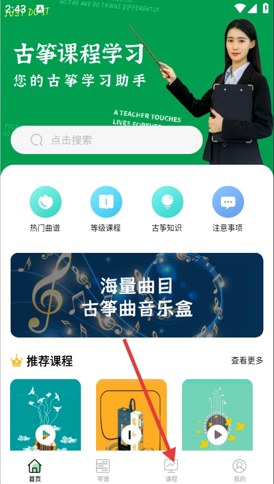 网站首页的功能区域整合了人气乐谱、分级课程、古筝相关知识及使用提醒等内容;若需进入课程页面,可点击底部导航栏中的“课程”选项。