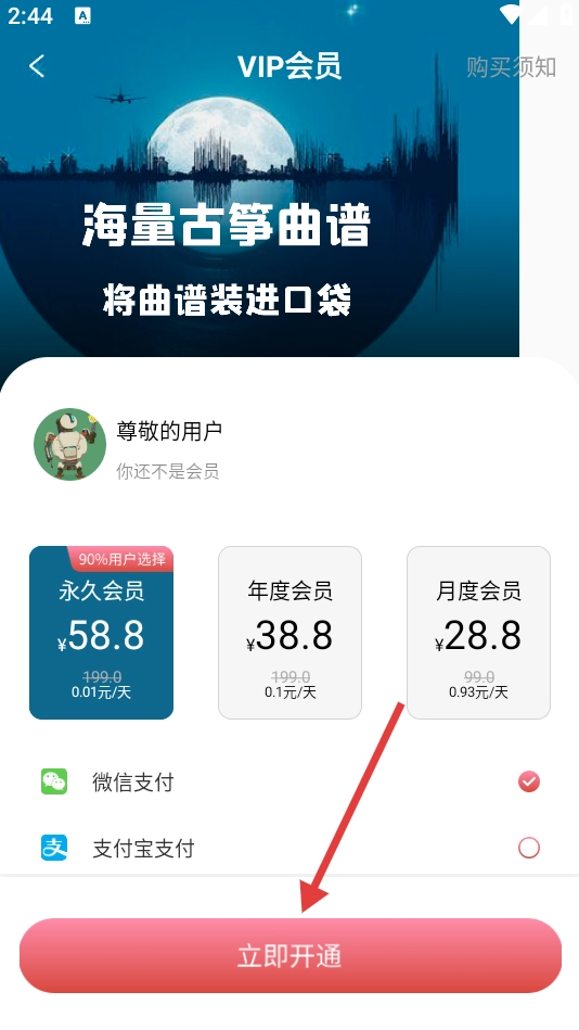 若想解锁所有课程内容,可选择会员套餐,选定支付方式后,点击红色的【立即开通】按钮,即可完成会员开通流程。
